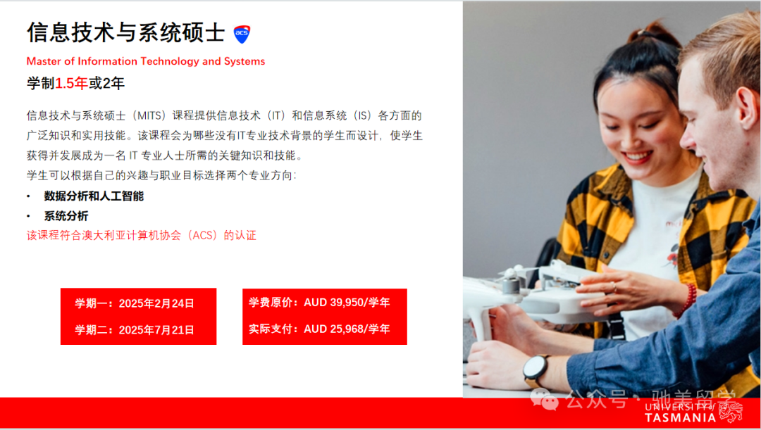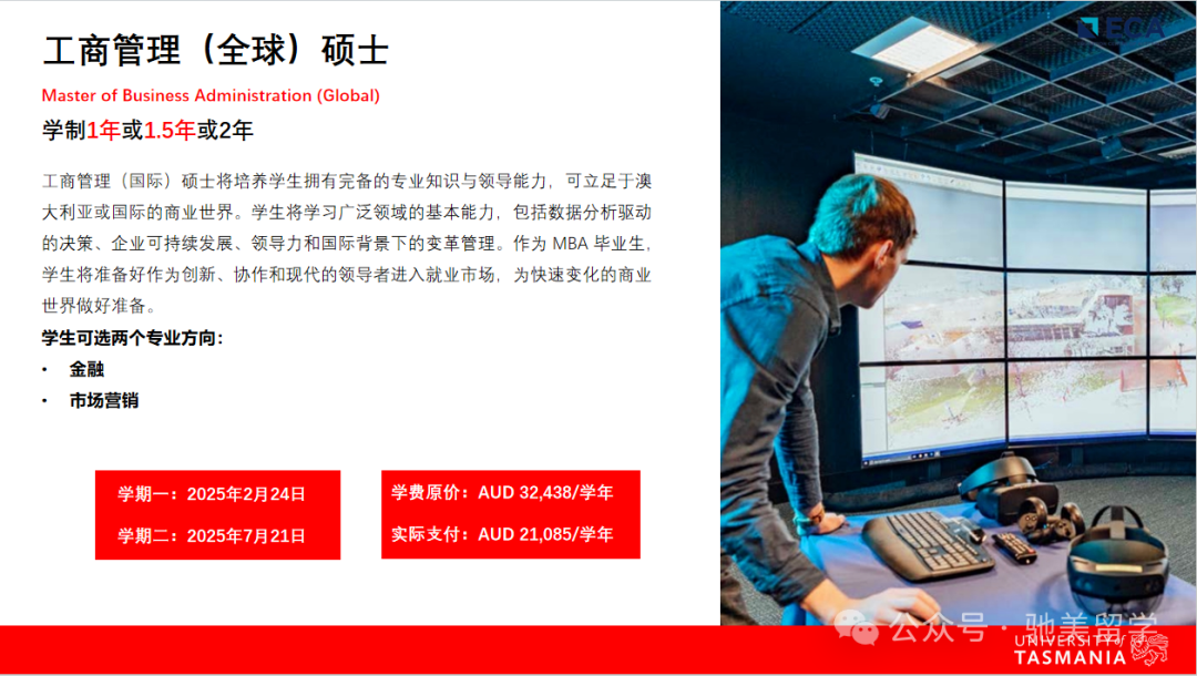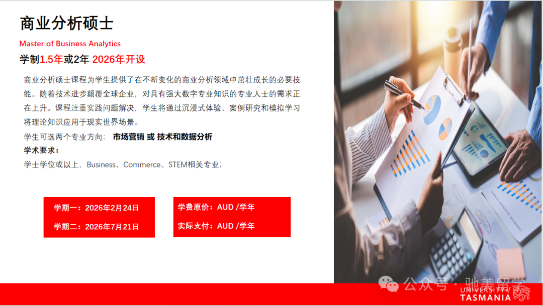 塔斯马尼亚大学,荣列全球学术排名前2%的顶尖学府之列,特设墨尔本与悉尼两大校区,为学子提供多元化选择。基于深入市场调研,精选商务学士、信息和通讯技术学士、工商管理硕士、信息技术与系统硕士、健康服务管理硕士、商业分析硕士等极具性价比的专业,于墨尔本及悉尼校区同步开设。更有高额奖学金助力中国学生,倾力打造高性价比、高质量的精品课程。