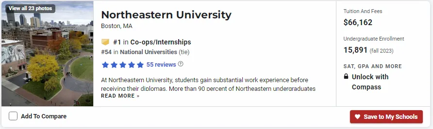 东北大学在整个新英格兰地区享有盛誉,Co-op项目使得大多数学生能够在毕业时已具备丰富的工作经验。在2008年金融危机期间,东北大学的学生依然能够找到工作,这得益于他们在校期间积累的丰富实习经验